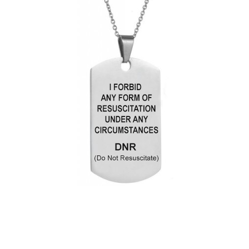 The back of the tag reads: “I forbid any form of resuscitation on me under any circumstances.” and DNR (Do Not Resuscitate).